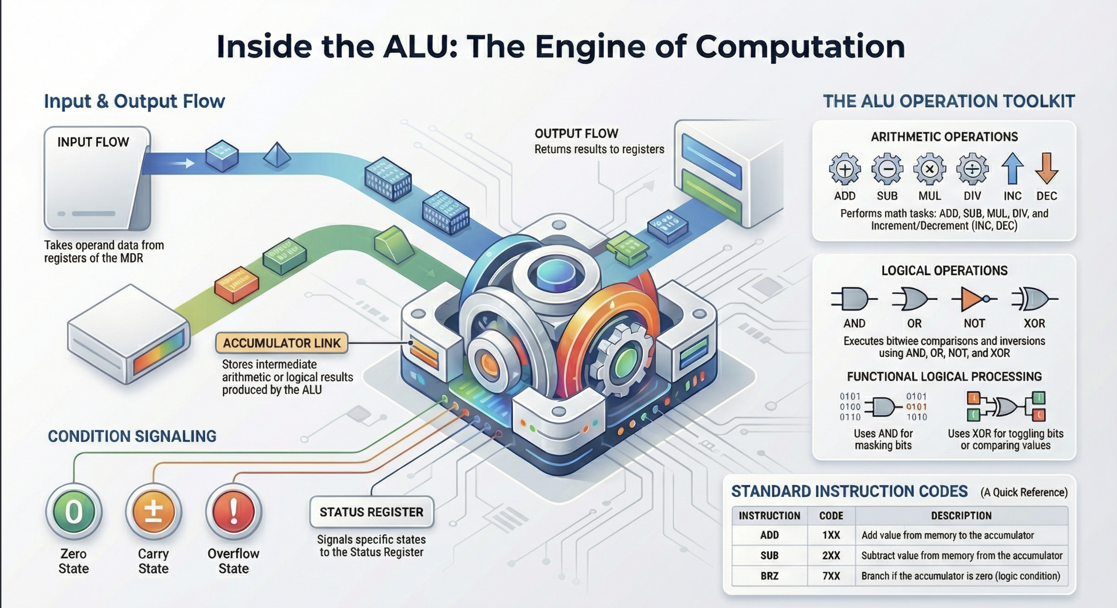 The ALU also updates the flags in the Status Register based on the result (e.g., if the sum is zero, the Zero Flag is set).