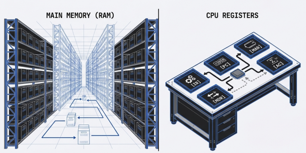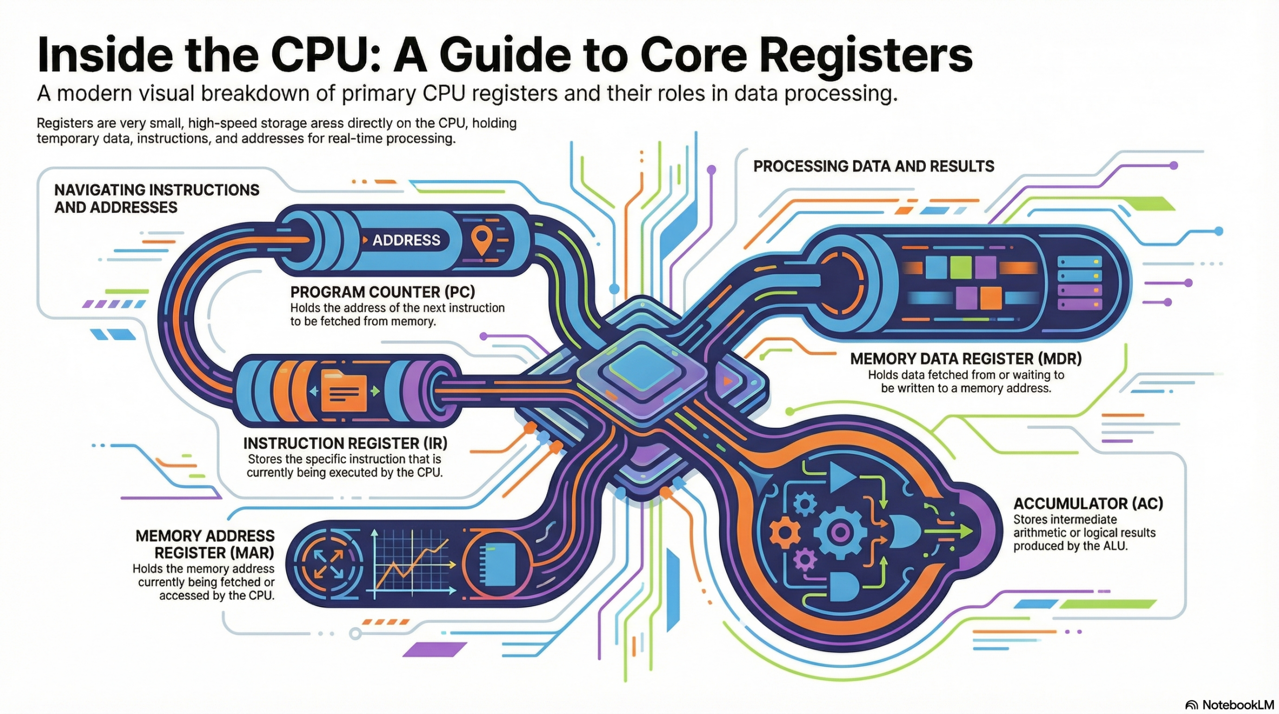 Registers are small, high-speed storage locations within the CPU itself, used to hold data, instructions, and memory addresses that the CPU is actively working with. Think of them as the CPU’s ‘working hands’ holding tools while a job is being done. Unlike main memory (RAM), which is external to the CPU, registers offer almost instantaneous access, making them critical for the CPU’s performance. The CPU relies on registers to quickly access operands, store intermediate results, and manage program control.