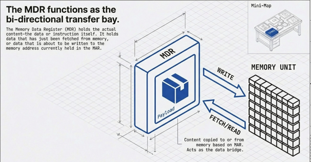 The ALU takes input data (operands) from registers or the MDR, performs the requested operation, and then typically places the result back into a register or the MDR. It also signals conditions (like zero, carry, or overflow) to the Status Register.