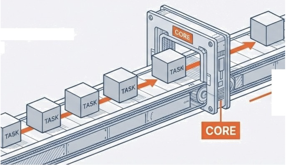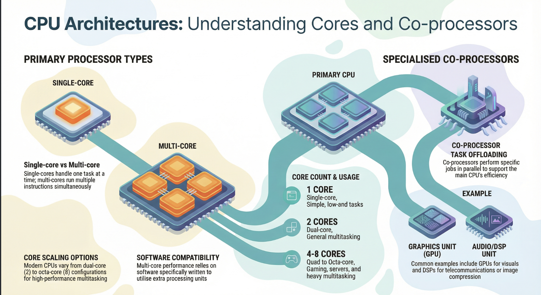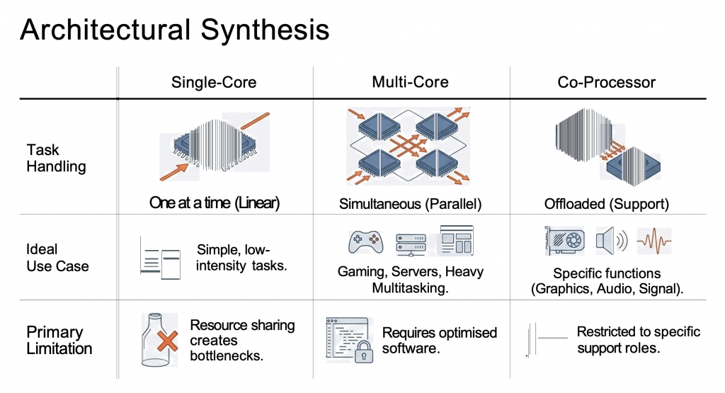 Comprises a few cores, but each is individually very powerful. Designed to handle complex instructions (one task at a time per core). Key Features: Branch Prediction (guessing future processes) and Out-of-order Execution (optimising task queues). This makes the CPU perfect for running the OS and applications where quick responses are vital.