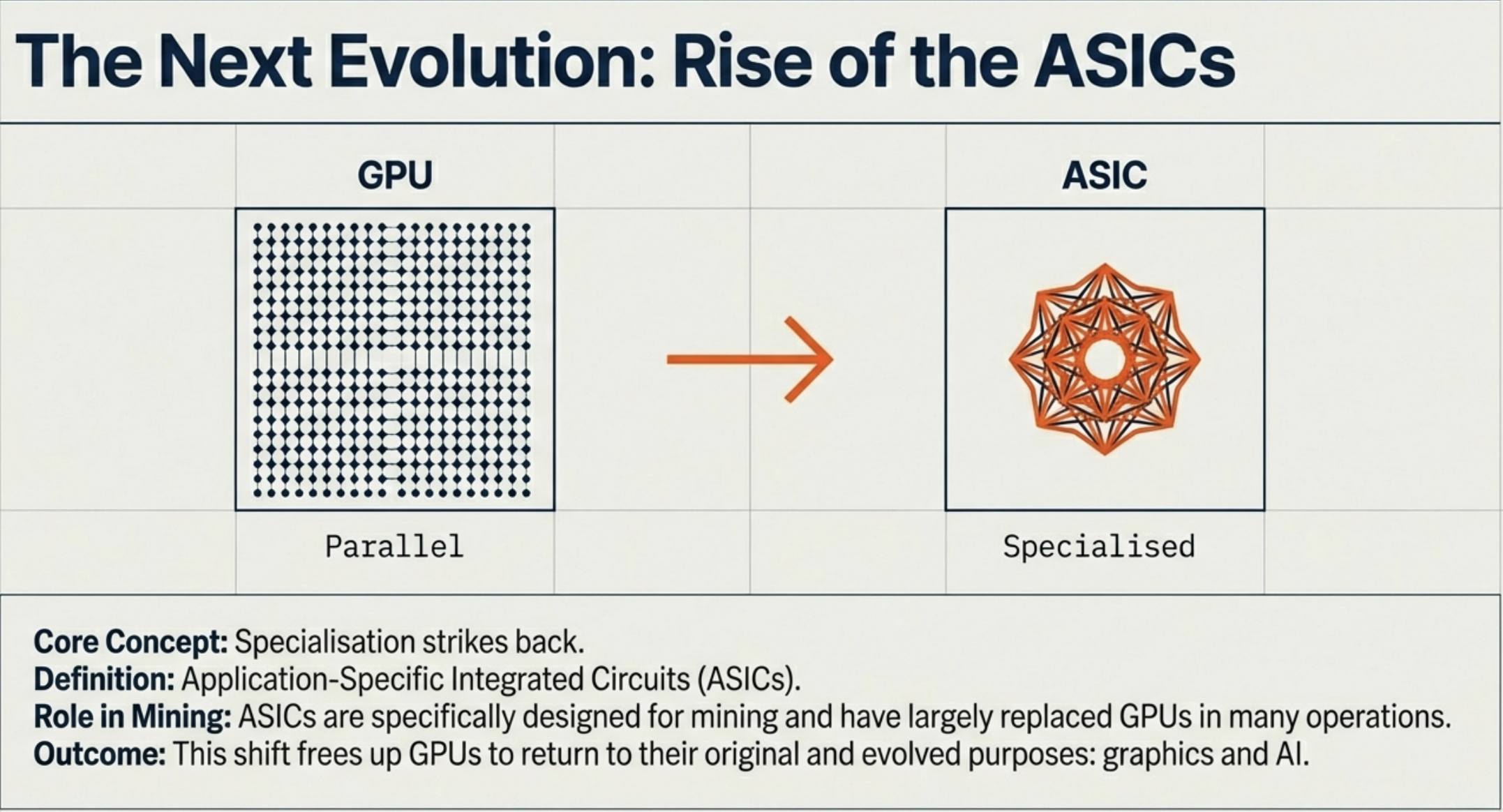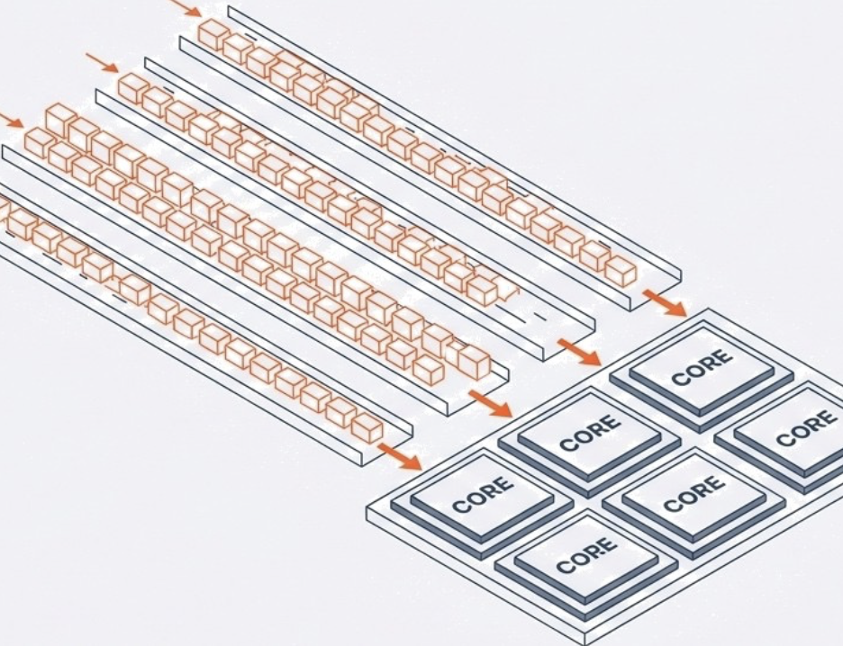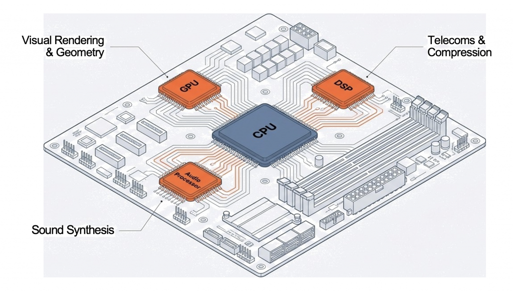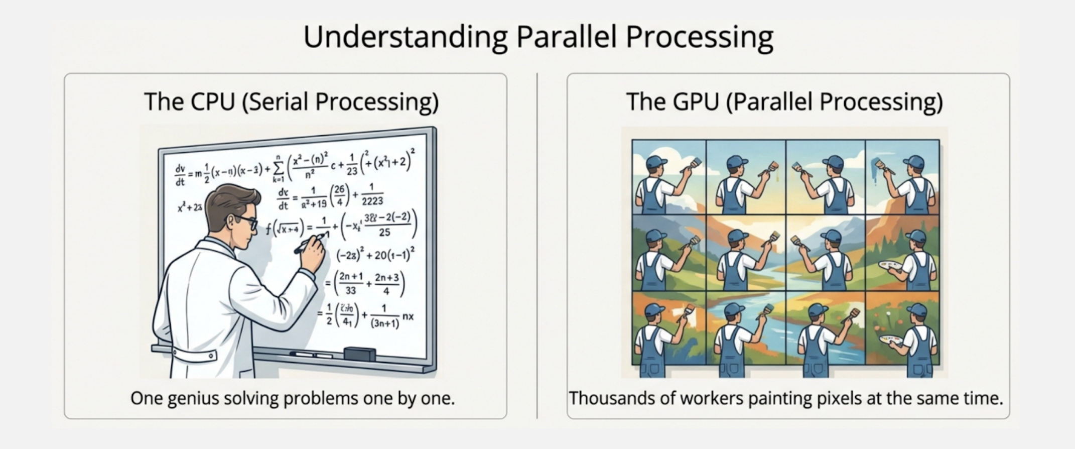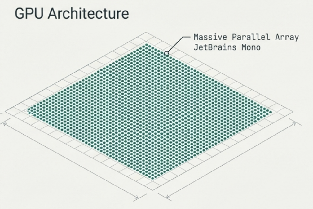 Comprises thousands of smaller, efficient cores. Individually less powerful, but designed for simultaneous operation. Key Features: Pure Parallelism. Ideal for executing similar calculations on large data sets all at once, such as rendering 3D images, where the math for millions of pixels must be calculated simultaneously to create a frame.