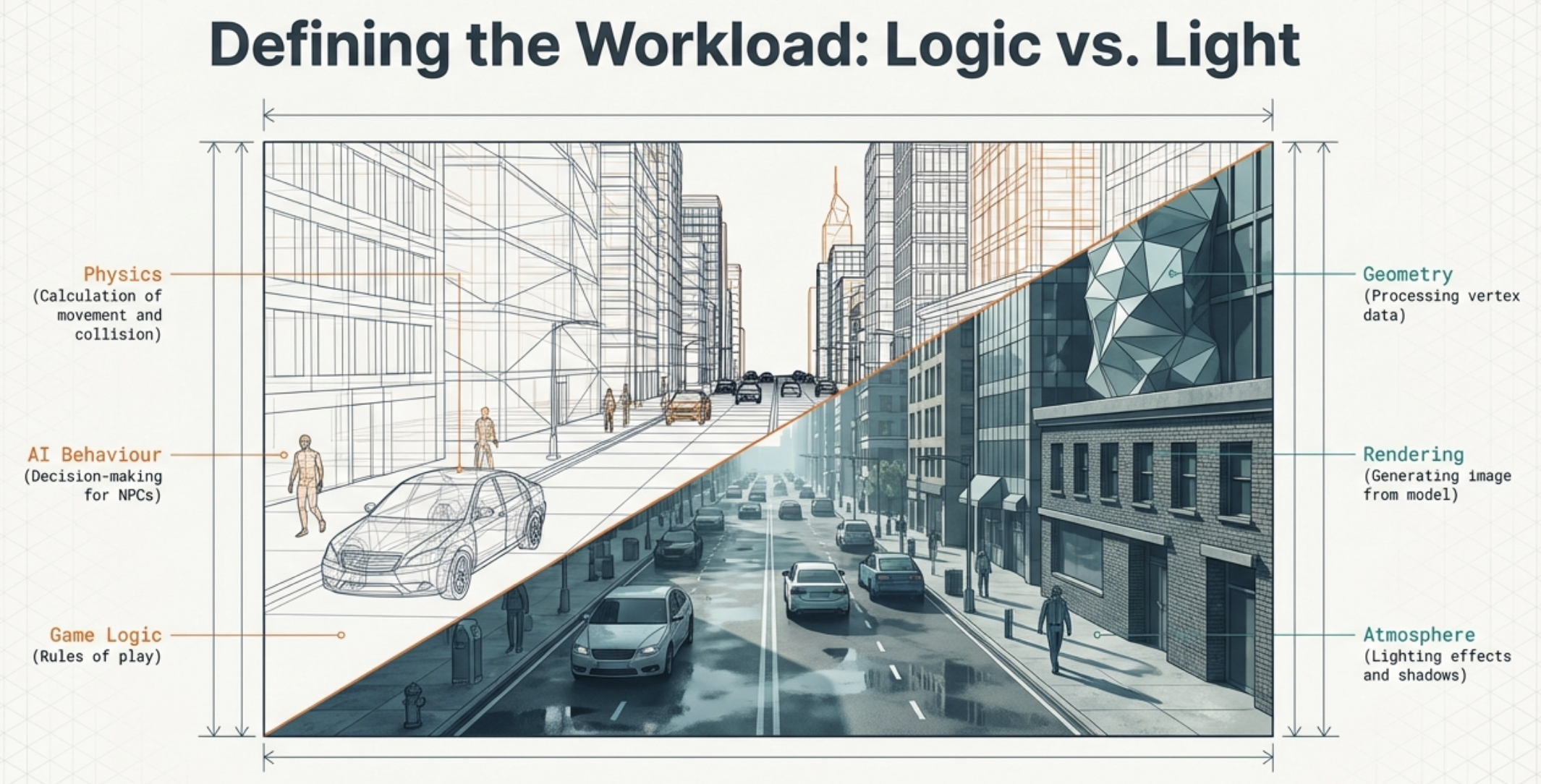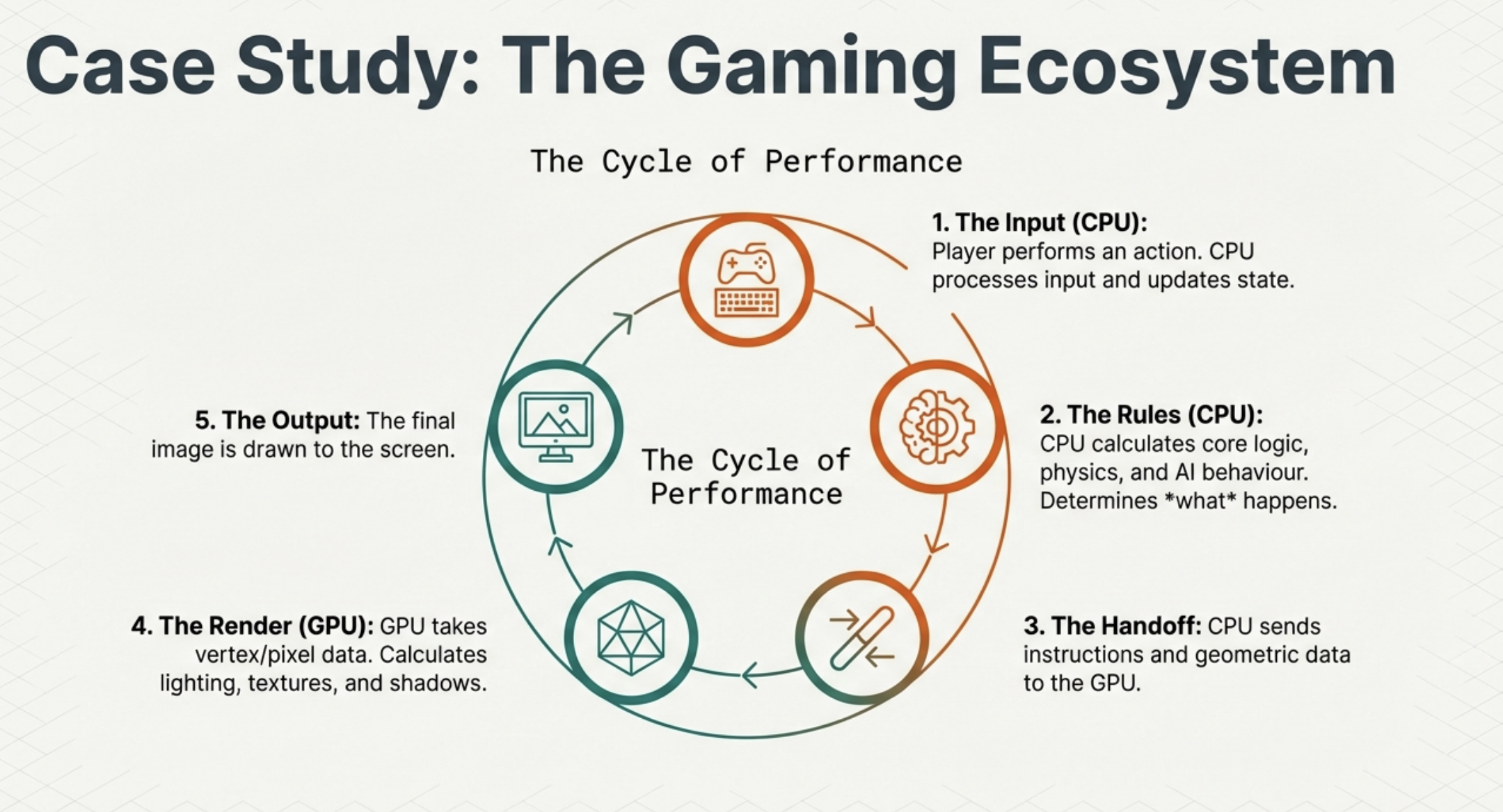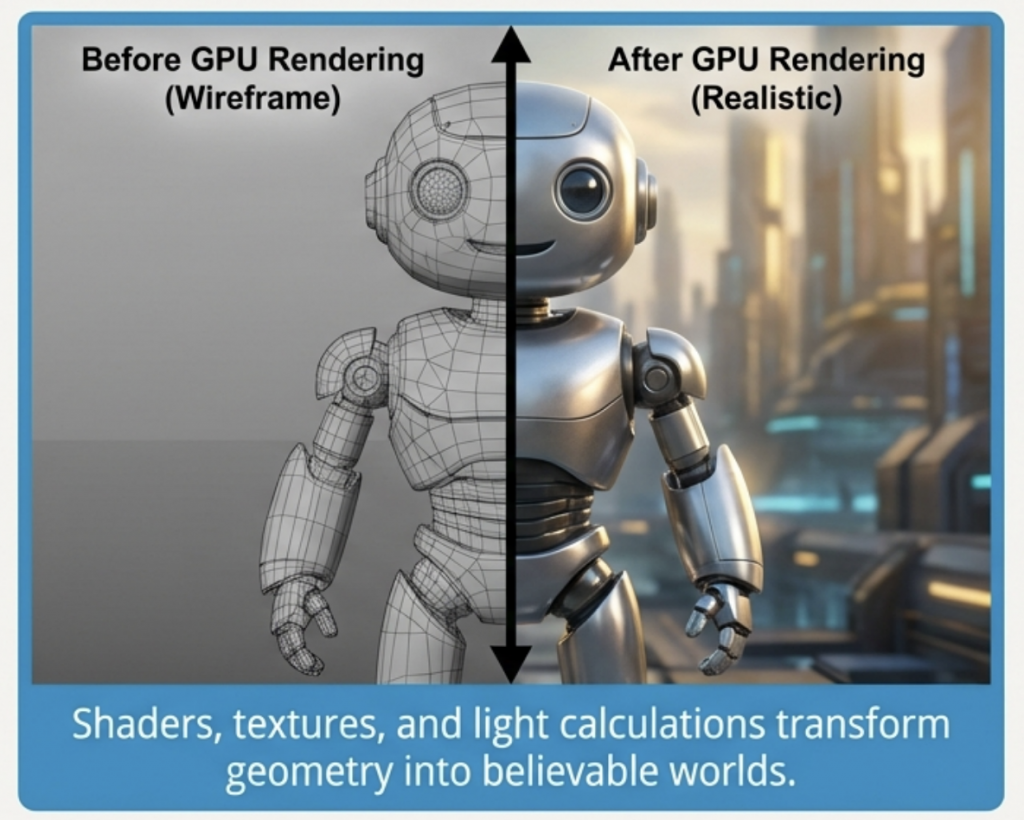 The CPU handles the logical underpinnings (wireframe), while the GPU manages the visual output (render). Both are essential for a complete interactive experience.