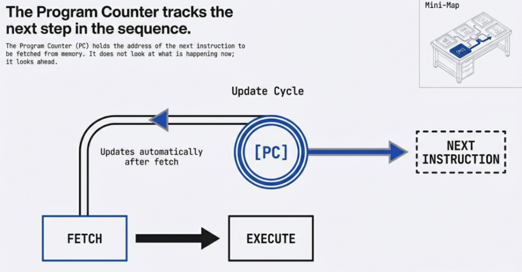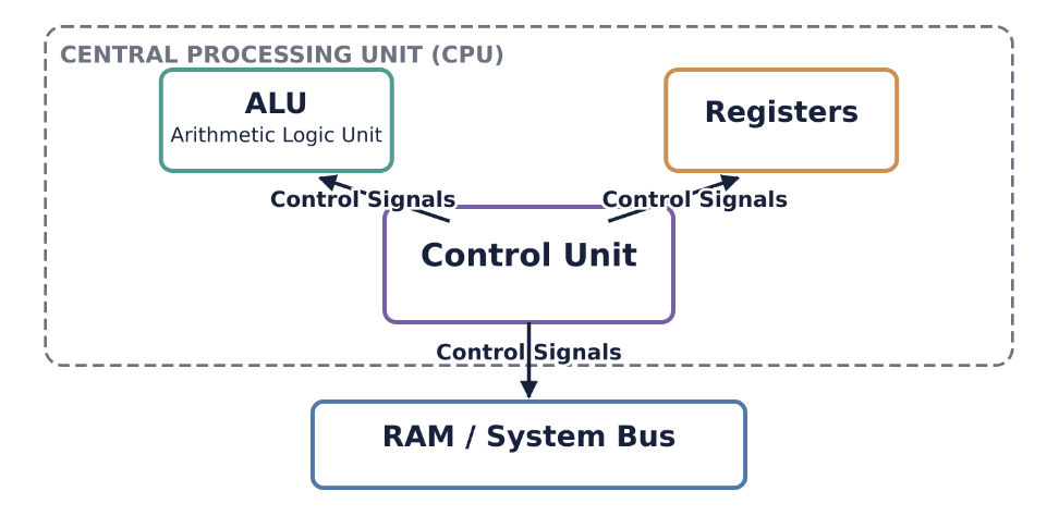 Instruction Cycle: Orchestrates the Fetch-Decode-Execute cycle, guiding the ALU.