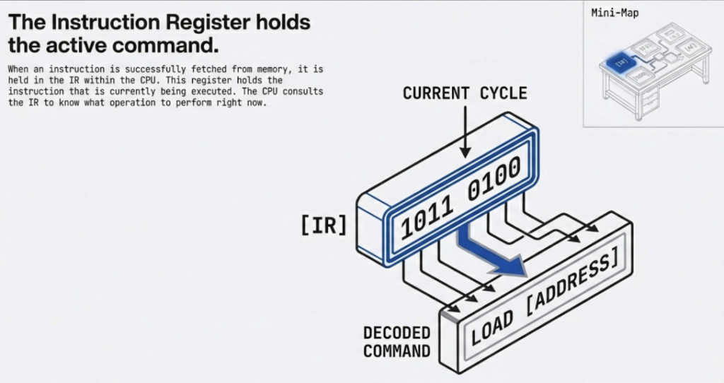 The Control Unit (CU) interprets the instruction held in the IR. It identifies the specific operation required and coordinates the hardware components—such as the ALU or specific buses—needed to perform the task.