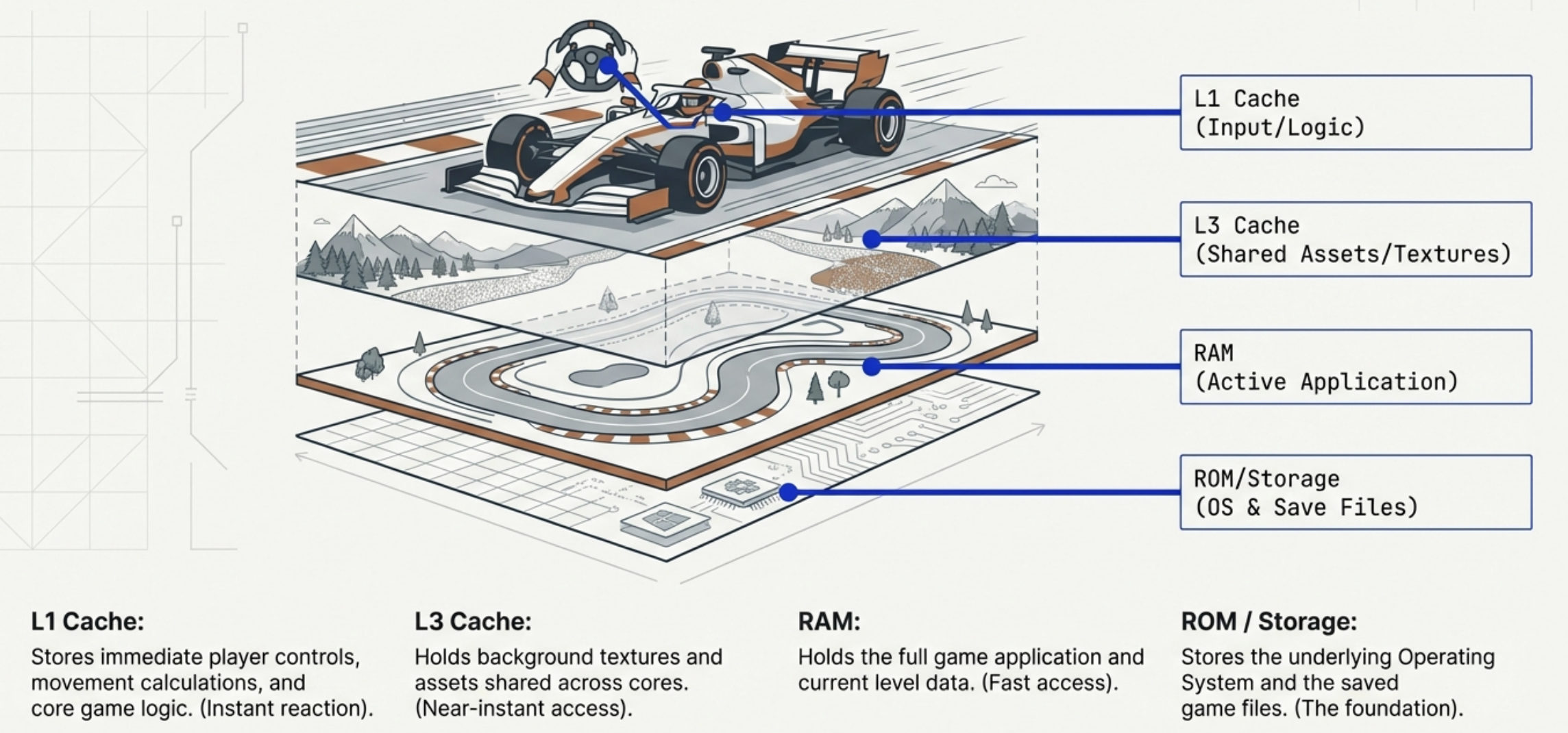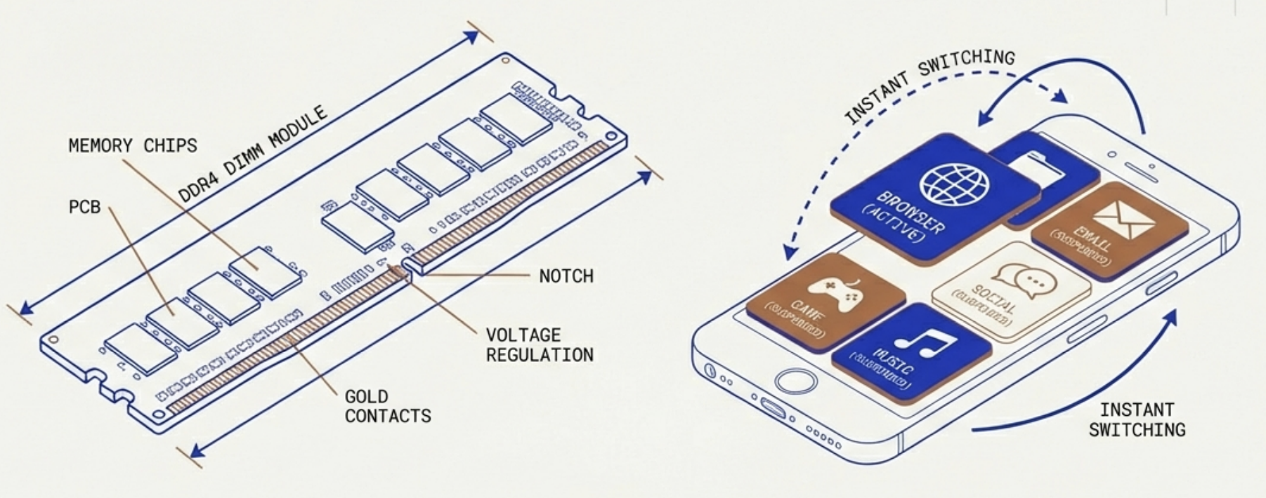 The Smartphone Analogy: RAM allows a phone to switch quickly between apps. When you leave an app, it stays suspended in RAM, allowing an instant return without reloading from scratch.
