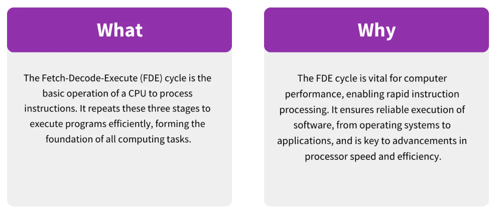 Use the mark allocation to judge how much detail to include. Questions on the fetch–decode–execute cycle often require a description of the stages alone, rather than an in-depth discussion of registers and buses.