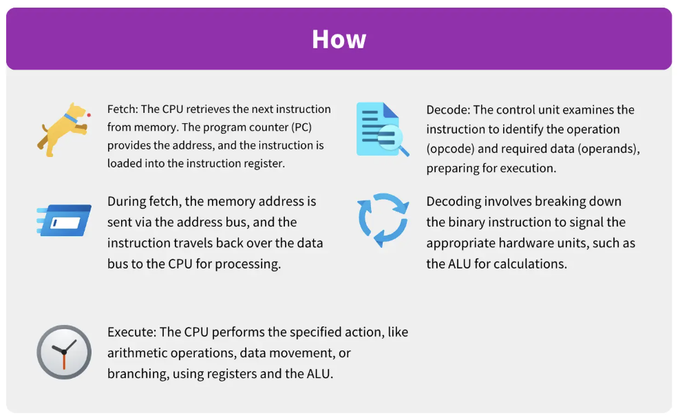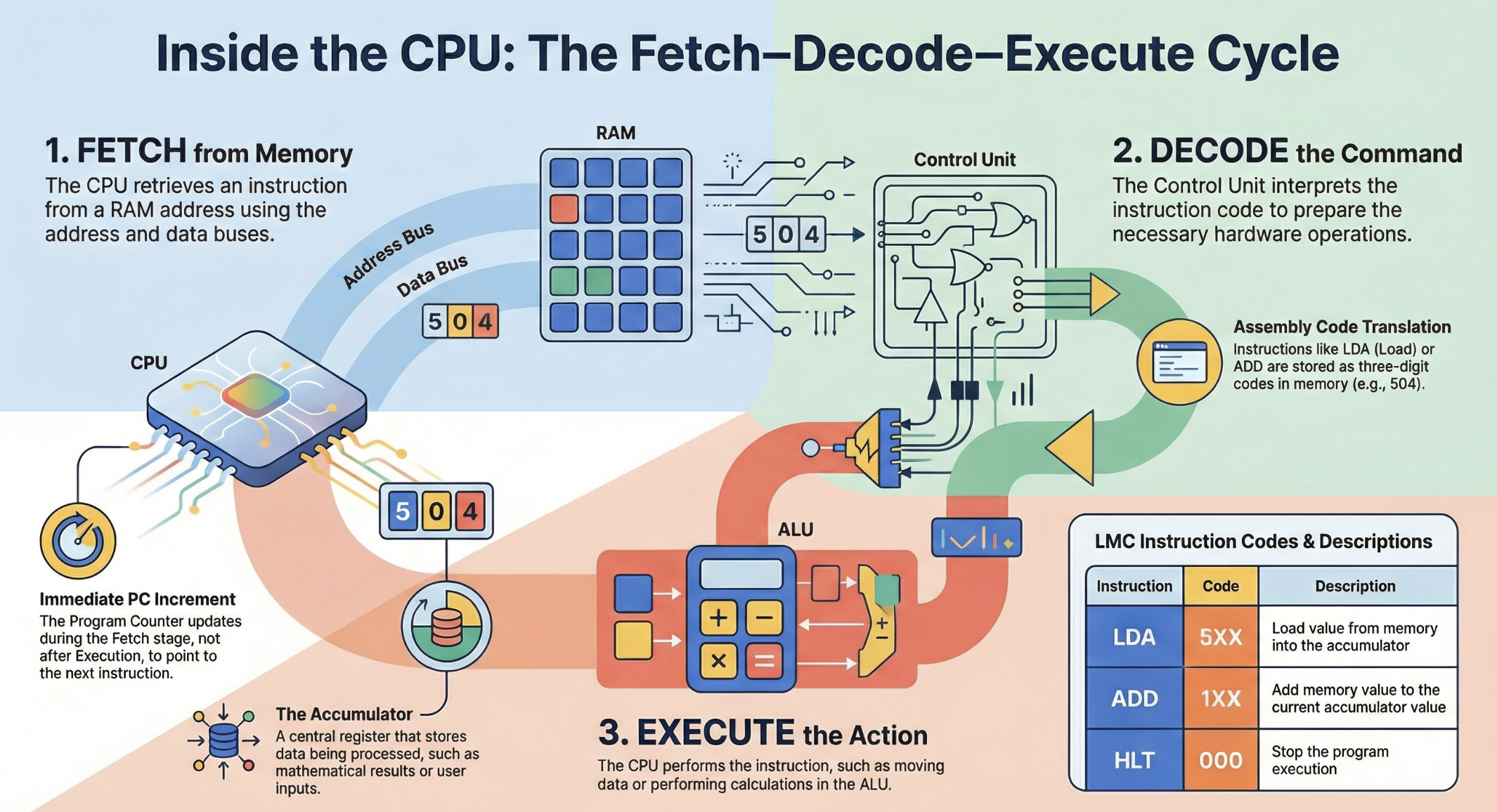 You can think of the FDE cycle as a chef in a kitchen. The Fetch stage is the chef grabbing a recipe from a book (RAM). Decoding is the chef reading and understanding the steps and gathering the necessary tools. Executing is the actual act of cooking the meal using the stove and pans (ALU and Registers). Pipelining is like having an assistant who starts prepping the next recipe as soon as the chef moves a dish to the oven, ensuring the kitchen never stops moving.