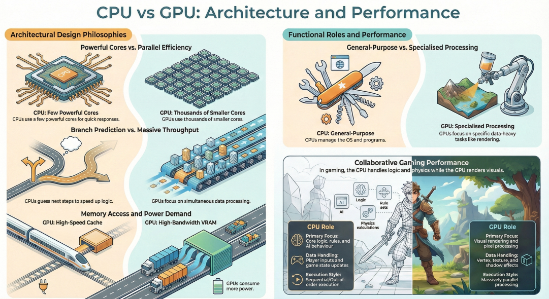 The CPU provides the intelligence to manage the system and predict branches. The GPU provides the raw power to process pixels in parallel.