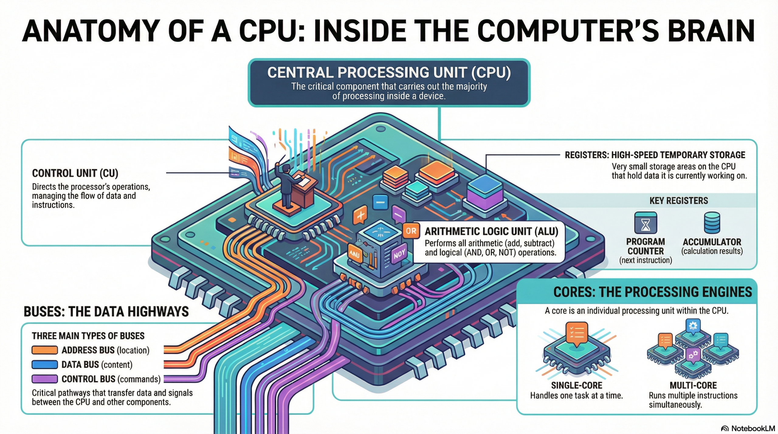 The Control Unit is often considered the “brain within the brain” of the CPU. It is responsible for orchestrating the CPU’s entire operation, directing the flow of data, and managing instruction execution. It interprets instructions and generates control signals that tell other components (like the ALU, registers, and buses) what to do and when to do it.